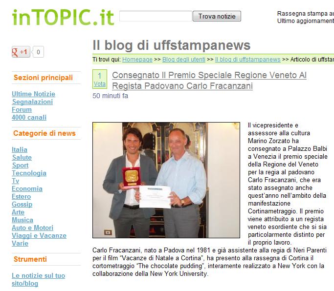 inTopic.it “Cortinametraggio: Premio Speciale Regione Veneto al regista padovano Carlo Fracanzani” Zoom in Read more